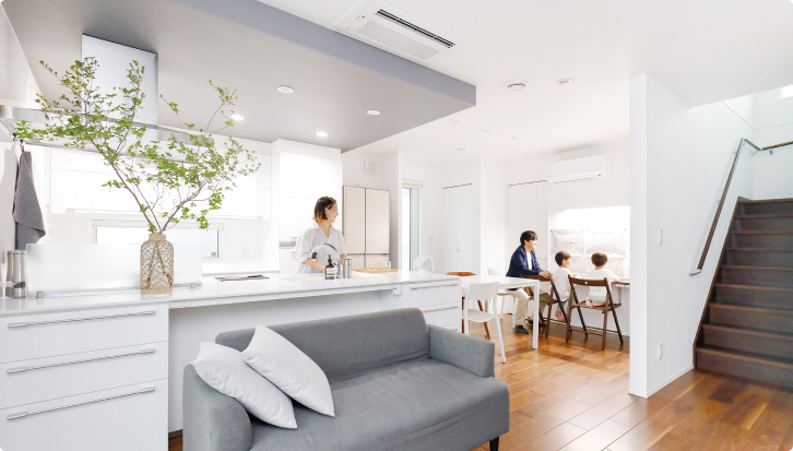家中を暖かく快適な温度に保つ全館床暖房。冬場、暖かいリビングから廊下に出た時や、浴室から脱衣所に戻った時など、室内のエリアを移動することで生まれる寒暖差がなくなるので、どこにいても心地よく、体にも負担を与えません。