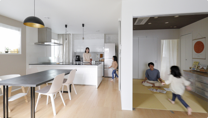 家中を暖かく快適な温度に保つ全館床暖房。冬場、暖かいリビングから廊下に出た時や、浴室から脱衣所に戻った時など、室内のエリアを移動することで生まれる寒暖差がなくなるので、どこにいても心地よく、体にも負担を与えません。