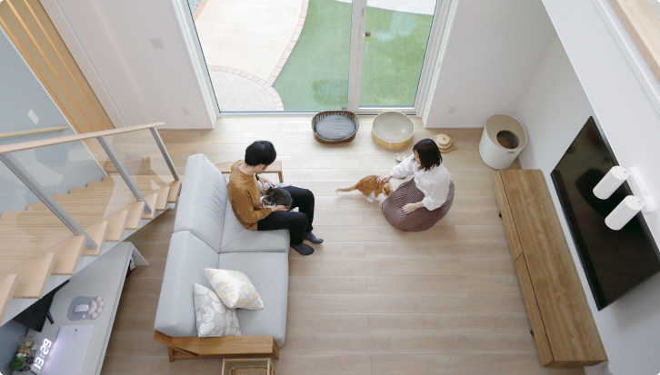 家中を暖かく快適な温度に保つ全館床暖房。冬場、暖かいリビングから廊下に出た時や、浴室から脱衣所に戻った時など、室内のエリアを移動することで生まれる寒暖差がなくなるので、どこにいても心地よく、体にも負担を与えません。
