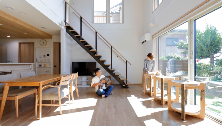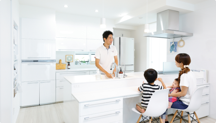 家中を暖かく快適な温度に保つ全館床暖房。冬場、暖かいリビングから廊下に出た時や、浴室から脱衣所に戻った時など、室内のエリアを移動することで生まれる寒暖差がなくなるので、どこにいても心地よく、体にも負担を与えません。