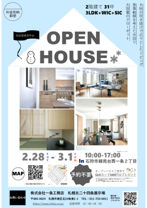 2/28~3/1(土日)【石狩市緑苑台西 分譲地内】 ☆31坪2階建て 3LDK+WIC+SIC ☆6帖の吹き抜けで解放感のあるLDK ☆家事動線を考えた水回り ☆大容量のクローゼット