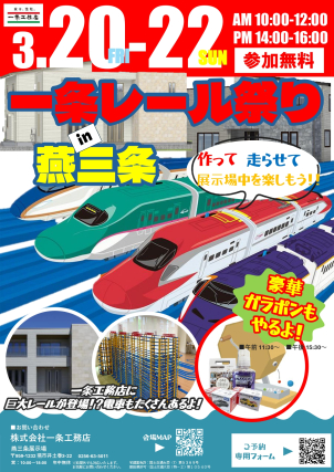 巨大レールが燕三条展示場に登場! たくさんのレールをつないだ大迫力のコースを、電車が走り抜けます。 普段なかなか見ることのできない巨大レイアウトは、お子さまも大興奮! ご家族みなさまで楽しめるイベントですので、ぜひお気軽にお越しください。