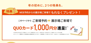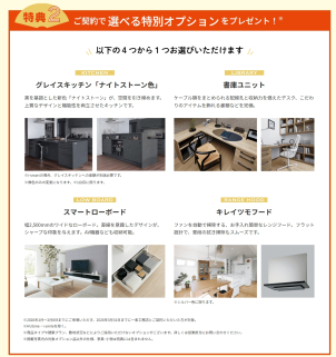 今だけのチャンス!1月中にWEB来場予約いただくとQUOカードの特典が、さらにご契約いただくと嬉しいオプションをプレゼント! ※商品タイプや建築タイプ、敷地状況によってご採用いただけない場合もございます。