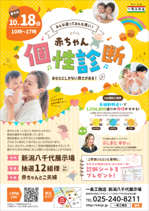 10月18日(土)新潟八千代展示場で「赤ちゃん個性診断イベント」を開催いたします! 赤ちゃんの『生まれ持った個性』がわかる! 子育てがちょっと楽に、もっと楽しくなるヒントをお届けします♪ ※本イベントは抽選制となっております。