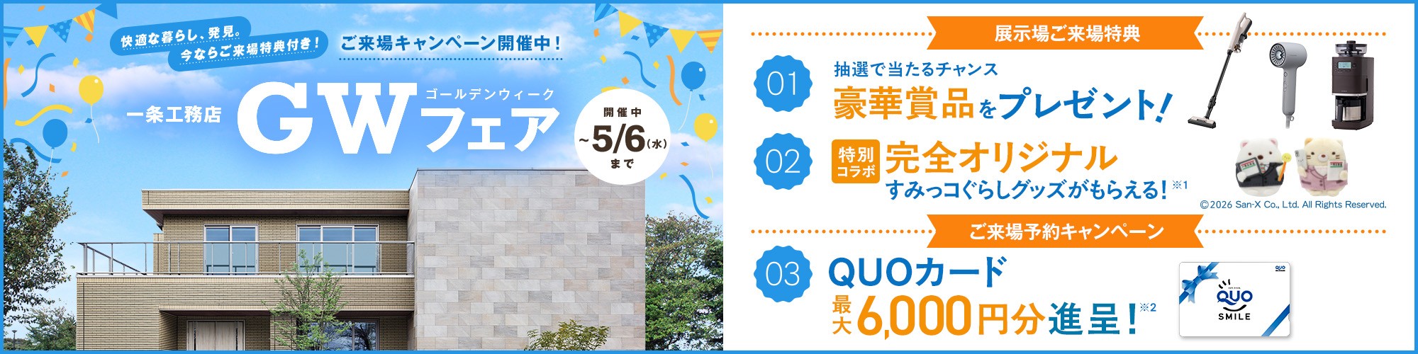 ※「豪華賞品プレゼント」は展示場にてご応募いただけます。ご応募は一家族様1回限りとさせていただきます。※QUOカードのプレゼントは当ページから初めて来場予約をされた⽅に限らせていただきます。一家族様につき1枚とさせていただきます。【QUOカード1,000円分:ご来場予約された方が対象】QUOカードはご来場から3週間以内に発送いたします。【QUOカード5,000円分:タブレットからクイズに答えた方が対象】QUOカードはタブレットのご返却から3週間以内に発送いたします。