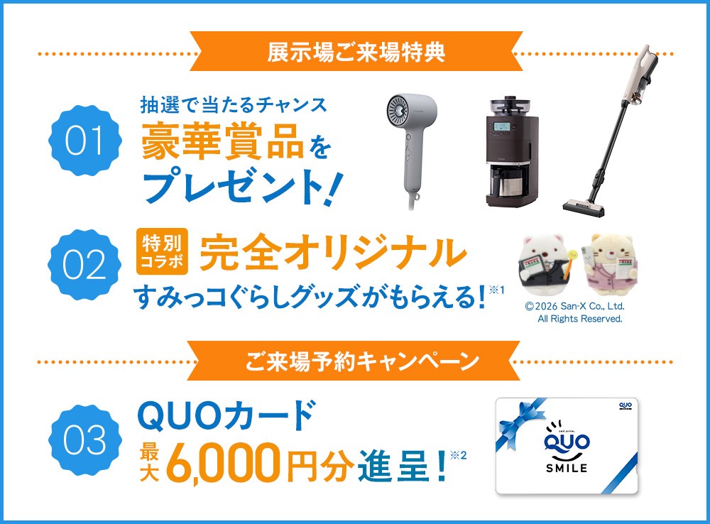 ※2 ホームページより来場予約を初めてご利⽤の⽅に限らせていただきます。一家族様につき1枚とさせていただきます。【QUOカード1,000円分:ご来場予約された方が対象】QUOカードはご来場から3週間以内に発送いたします。 【QUOカード5,000円分:タブレットをご視聴いただき、クイズに答えた方が対象】QUOカードはタブレットのご返却から3週間以内に発送いたします。