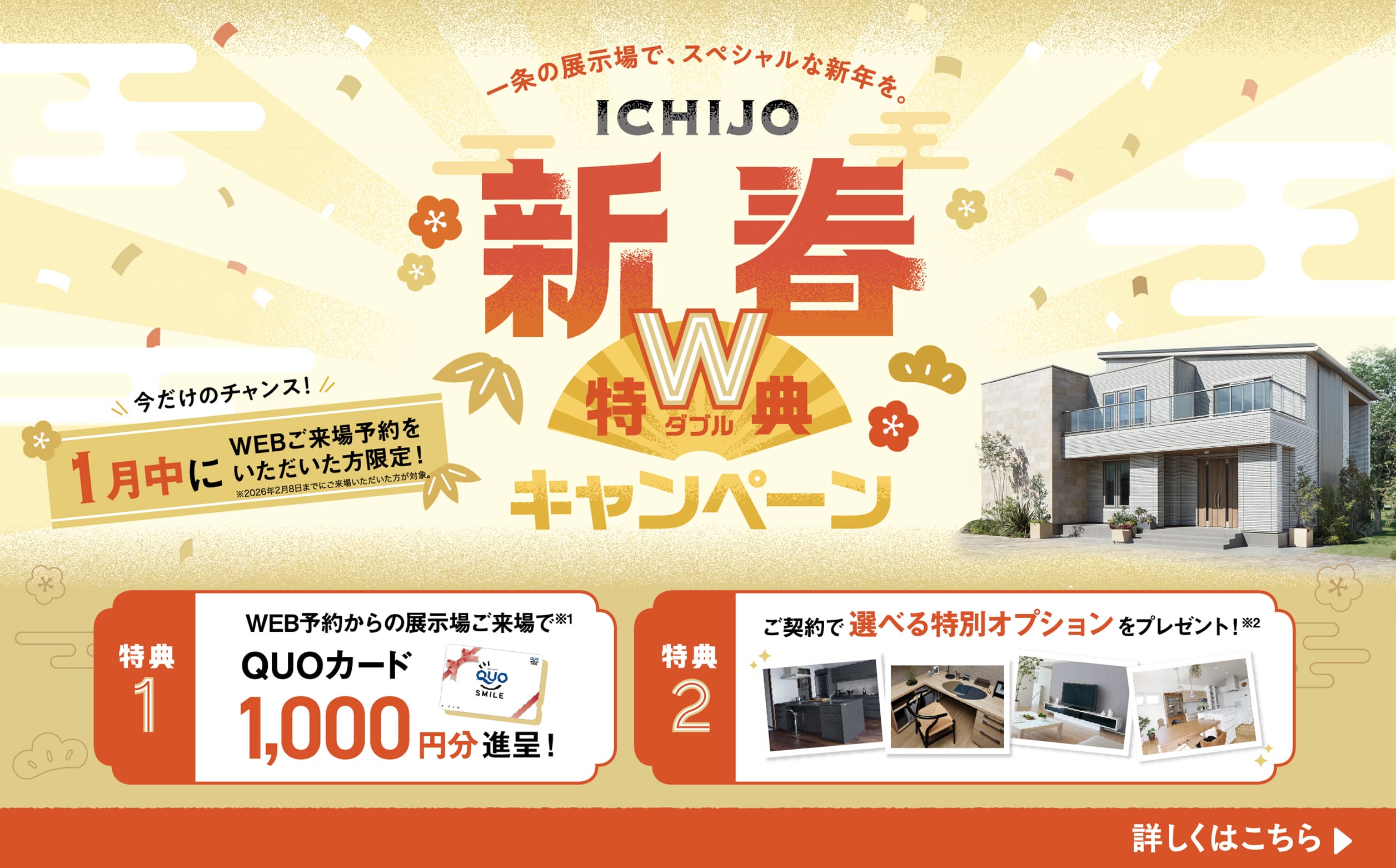 ※2 2026年3月31日までに、一条工務店とご契約いただいた方が対象。HUGme‧i-smileを除く※商品タイプや建築プラン‧敷地状況などによりご採用いただけないオプションがございます。