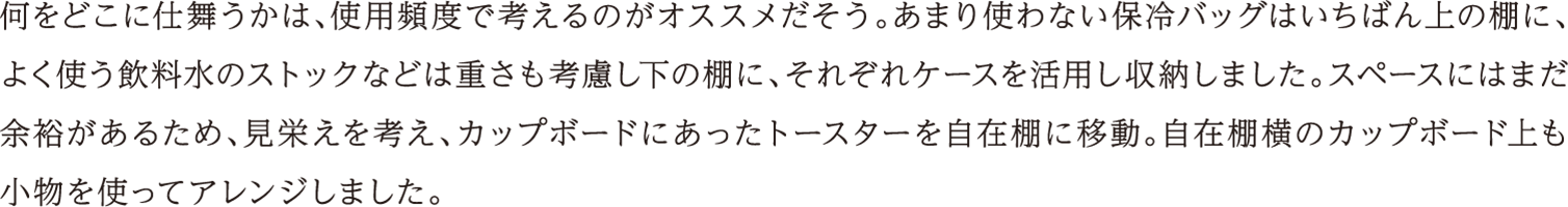 何をどこに仕舞うかは、使用頻度で考えるのがオススメだそう。あまり使わない保冷バッグはいちばん上の棚に、よく使う飲料水のストックなどは重さも考慮し下の棚に、それぞれケースを活用し収納しました。スペースにはまだ余裕があるため、見栄えを考え、カップボードにあったトースターを自在棚に移動。自在棚横のカップボード上も小物を使ってアレンジしました。