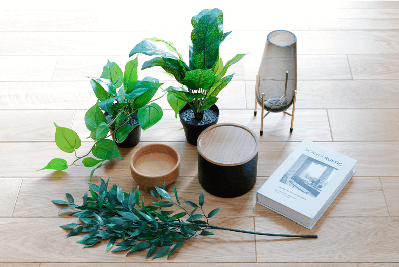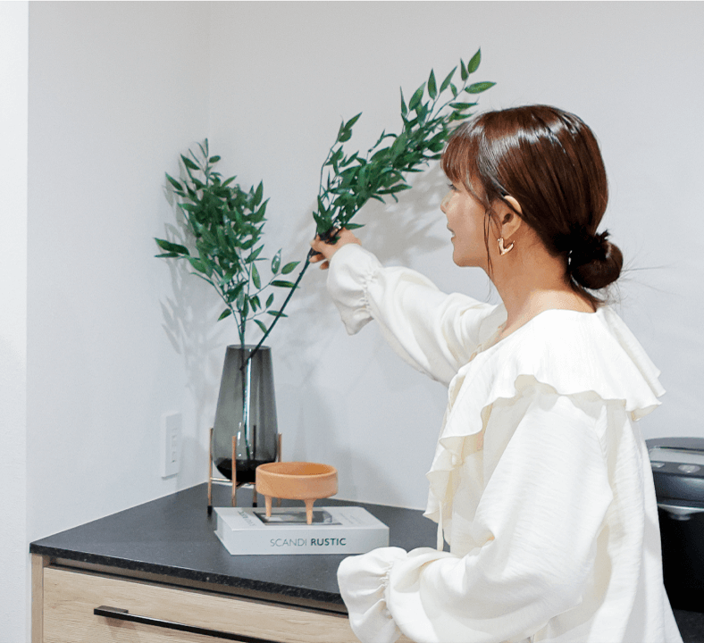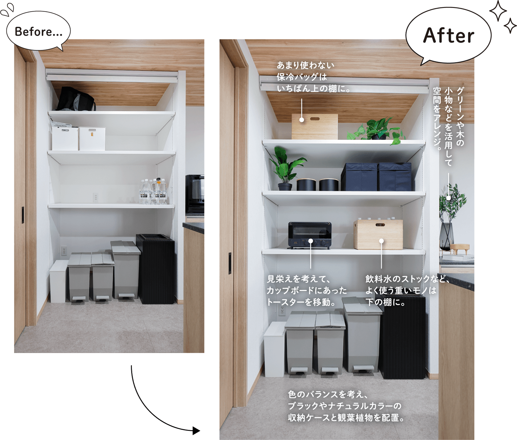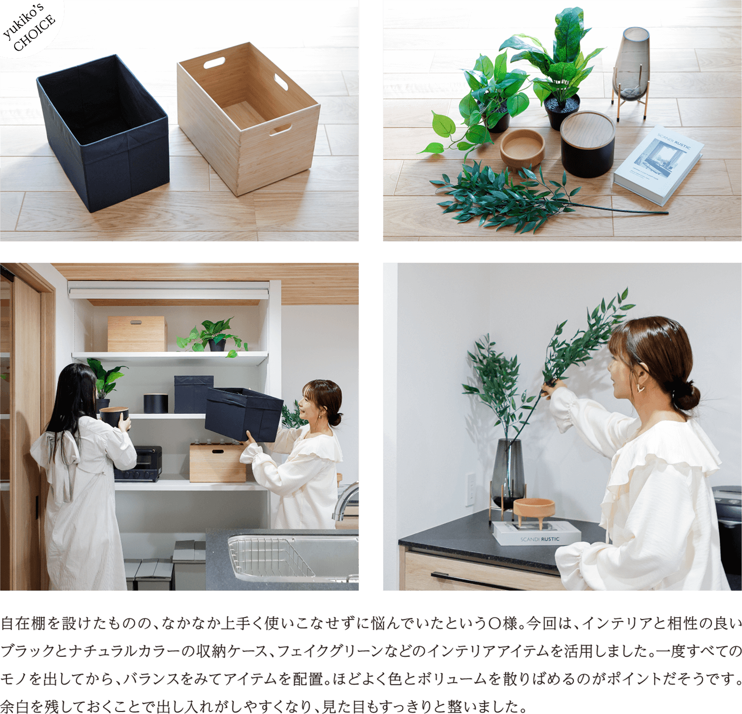 自在棚を設けたものの、なかなか上手く使いこなせずに悩んでいたというO様。今回は、インテリアと相性の良いブラックとナチュラルカラーの収納ケース、フェイクグリーンなどのインテリアアイテムを活用しました。一度すべてのモノを出してから、バランスをみてアイテムを配置。ほどよく色とボリュームを散りばめるのがポイントだそうです。余白を残しておくことで出し入れがしやすくなり、見た目もすっきりと整いました。