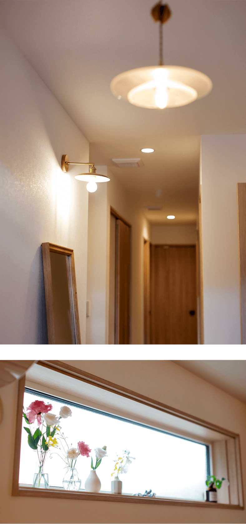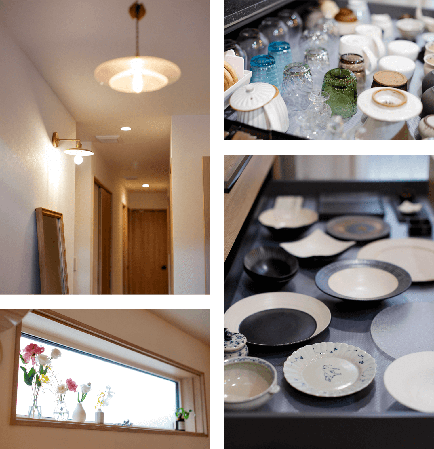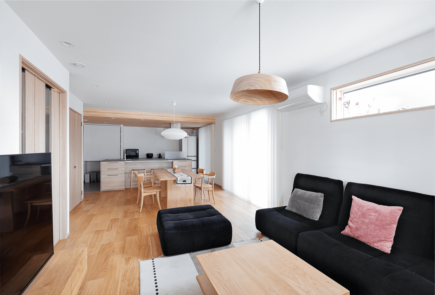 「和モダン」をテーマに、温もりを感じるインテリア選びや配色をしたというO様邸。空間の主役となるダイニングテーブルを最初に決め、そこからリビング全体の雰囲気を組み立てていったそうです。リビングの照明は、地元の作家さんにオーダーしたものなのだとか。