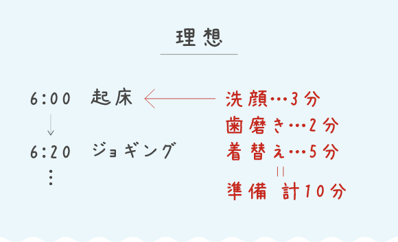 「やりたいこと」ができている理想的な1日は、どんな生活なのか、イメージして具体的に書き出してみましょう。合わせて、いつもの自分は1日をどう過ごしているかも書き出してみます。並べてみると、理想と現実のギャップが明らかに!