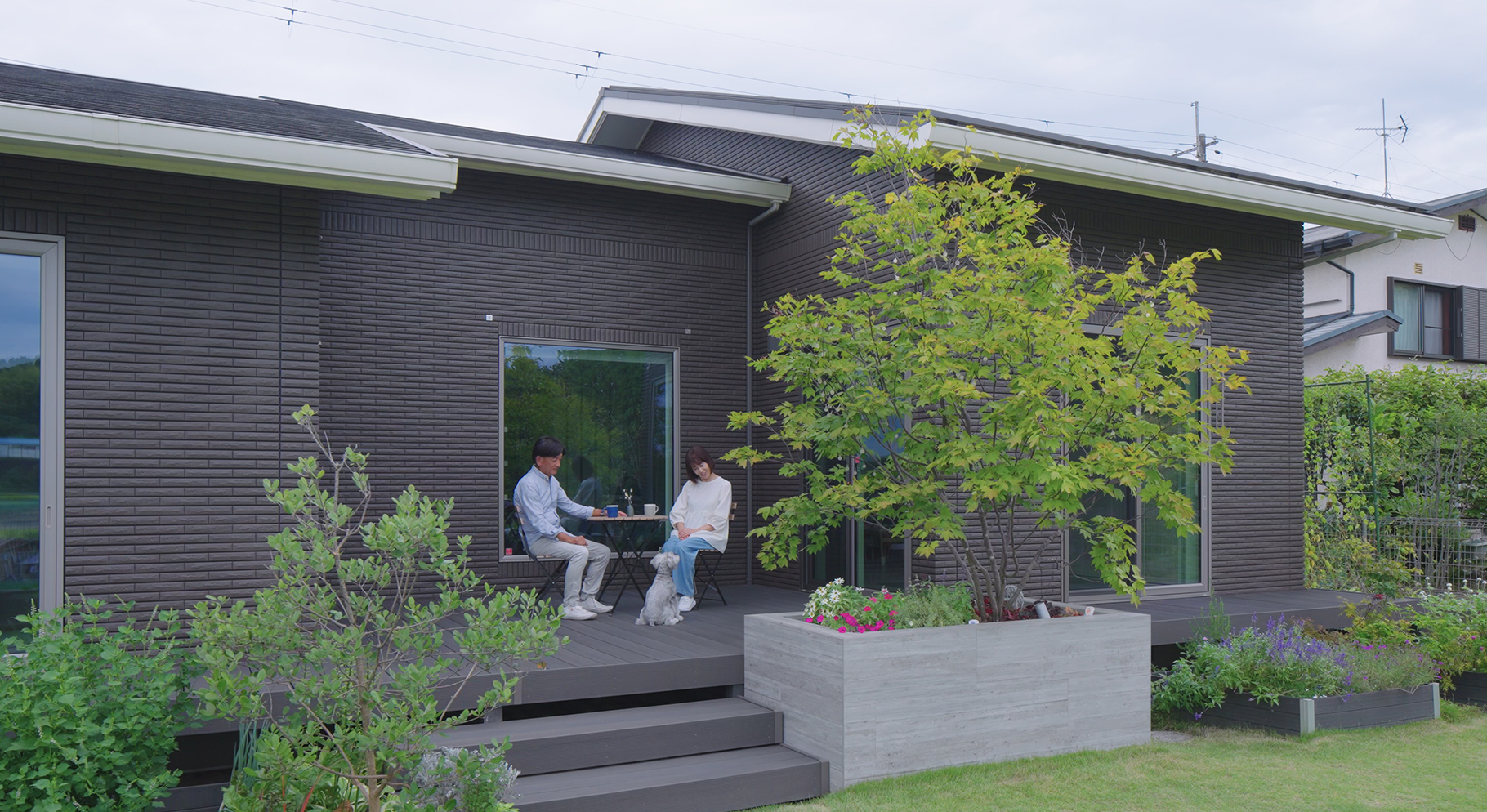 家の南側に設けたウッドデッキは憩いの場