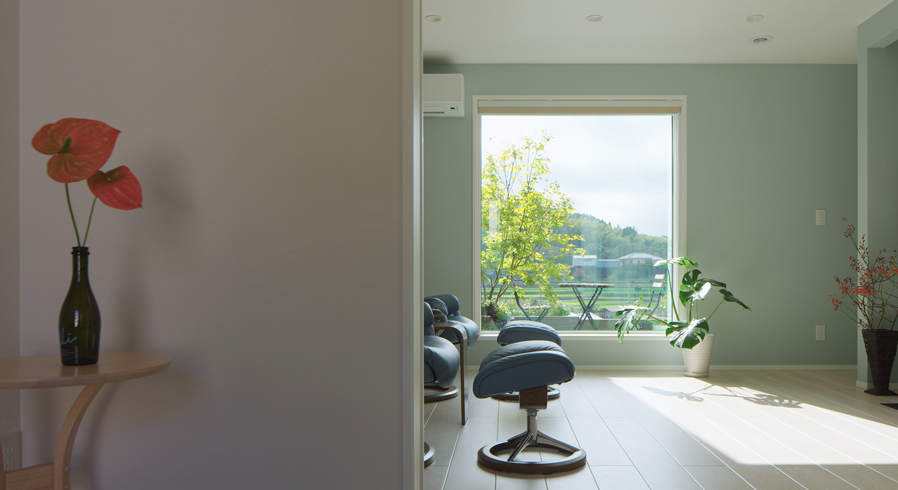 玄関を開けた真正面には大きなフィックス窓があり、リビング越しにお庭と景色を見渡せるようにしています。自然豊かな場所なので、家の中からも自然を満喫したいというこだわりです。