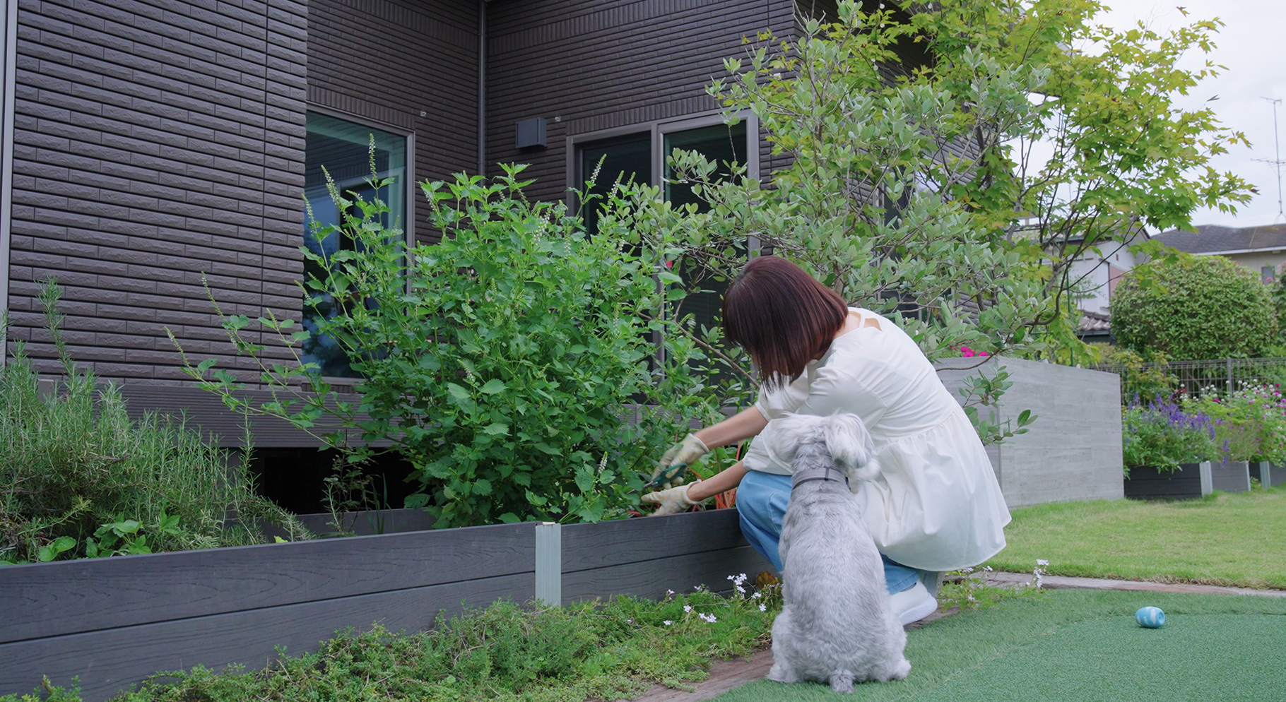 お庭では長年の憧れだった家庭菜園で四季の野菜を育てたり、イチゴやブルーベリーなどの果実を植えたりして楽しんでいます。また、夫婦ともにゴルフが趣味なので、お庭の一角にパター練習ができるように人工芝も取り入れました。
