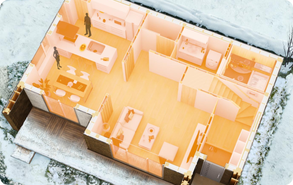 リビングをはじめ、各居室や廊下、浴室、洗面所、玄関まで家じゅうをやさしい暖かさで包み込むのが一条の「全館床暖房」。エアコン暖房のように部屋の上部と下部で温度差がなく、家全体をムラなく暖めます。家の中の温度差が原因で起こるヒートショックの心配もなく、足元・指先から体の芯までぽかぽかと心地よく過ごせます。