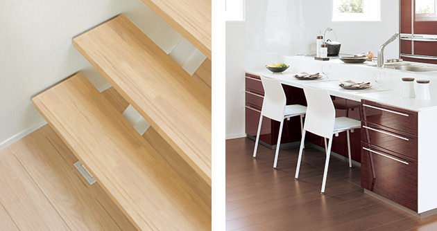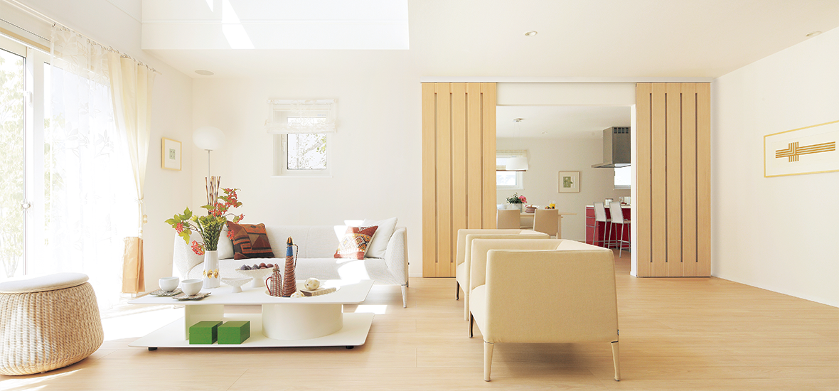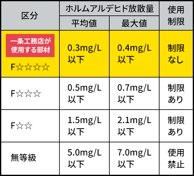 シックスハウス症候群の主な原因とされるのが、住まいの建材や接着剤などに含まれているホルムアルデヒド。これらの室内の空気に悪影響を与える物質の使用を制御するため、JASおよびJIS規格では、このホルムアルデヒドの空気中への放散量に関する等級を4種類に表示区分しています。一条では、床材はもちろん住宅設備の扉や内部にまで、もっとも放散量の少ない「F☆☆☆☆」グレードのものを採用。自ら行った室内空気質環境実験でも安全性が確認されています。