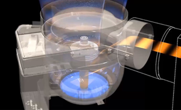 加湿ユニットに自動給水された水を、回転する「ディスク」の遠心力によって吸い上げます。その水が水平に飛び出し加湿ユニットの内壁に当たってミストになり、換気による空気の流れで家中に行きわたります。
