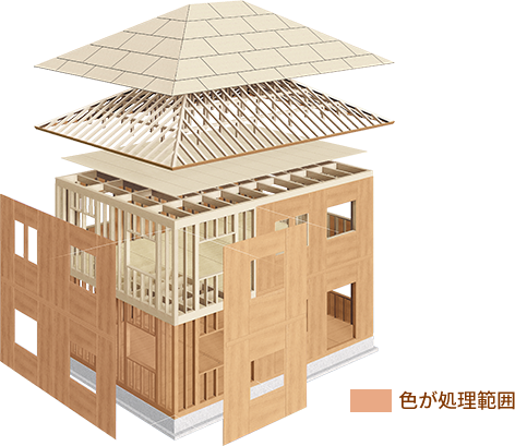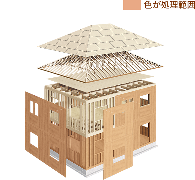 外部に接し、シロアリや腐れの影響を受けやすい構造材及び下地材には、隙間なく徹底的な処理を施すことが重要です。一条の家は、組み合わせると見えなくなる部材の面も工場で丸ごと処理。躯体の組み立て後に薬剤を表面塗布する一般的な現場処理とは異なり、シロアリの入る弱点をつくりません。