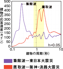 低層住宅に大きなダメージを与えるのは周期1秒前後の揺れ「キラーパルス(右図黄色部分)」。東日本大震災の「築館波」よりも、阪神・淡路大震災の「鷹取波」の方が大きく力が加わっていることがわかります。「鷹取波」の方が加速度(ガル)は小さいのに、建物を壊すパワーはなんと100倍も大きいのです。