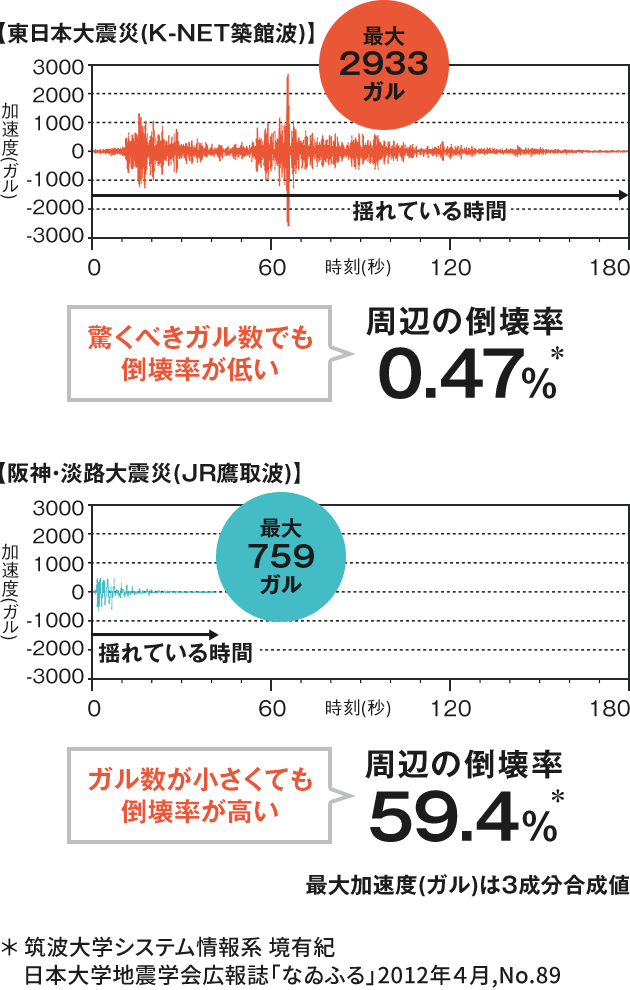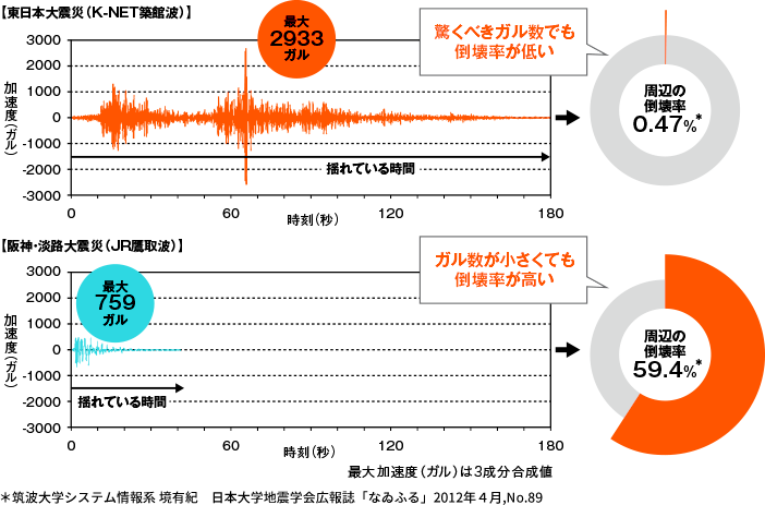 下記の二つの図は、東日本大震災と阪神・淡路大震災の地震波比較です。二つの地震波を比べると、加速度は東日本大震災の方が約4.5倍も大きいにも関わらず、建物の倒壊率は阪神・淡路大震災の約1/125でした。