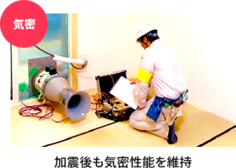 一条の実験基準は、倒壊しないことではなく、「地震後も安心して生活が送れる」こと。実験前後の気密測定では、その性能値(C値)の変化がなく、建物の気密性能が維持されていることを立証。太陽光パネルも正常に通電し、外壁タイルの落下もありませんでした。
