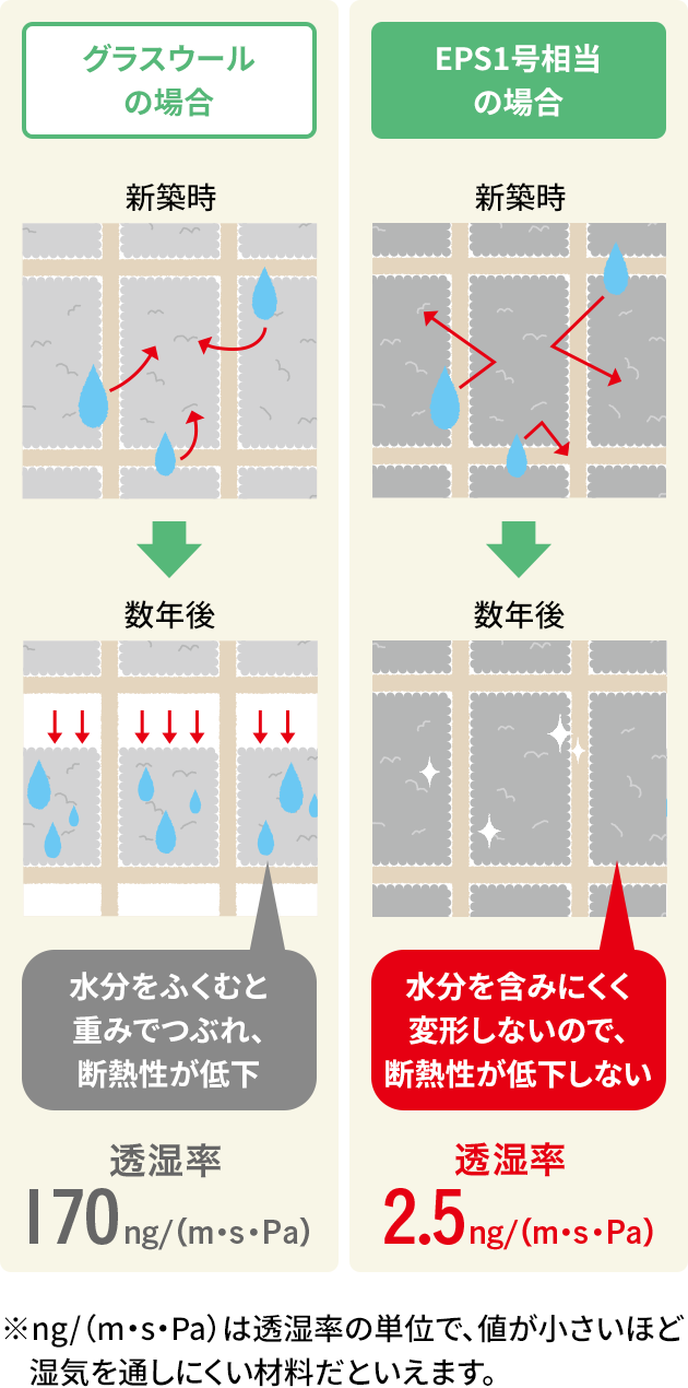 結露というと冬場に発生するイメージですが、「暑い屋外」と「冷房の効いた室内」の温度差で発生する「夏型結露」にも注意が必要です。「夏型結露」は家の中ではなく壁の中、特に断熱材の内部で発生します。一条の「高性能ウレタンフォーム」や「EPS」など、水蒸気を通しにくい発泡プラスチック系断熱材なら、水分を含みにくいので「夏型結露」の心配もなく、変形もしにくいため耐久性も保てます。