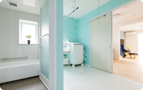 時間を気にせずいつでも干せるのも、部屋干しの大きなメリット。加えて、家中がどこでも乾きやすい環境だから、洗濯物が多くても安心。部屋の一角だけでなく、ホールや日当たりのわるい位置に設けた洗面・脱衣室など、干す場所に困りません。