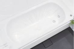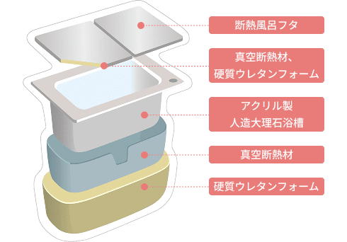 浴槽を覆うのは「真空断熱材」。冷蔵庫や自動販売機、冷凍車にも使われている優れた断熱材で、中を真空状態にして、熱伝導を限りなくゼロに近づけています。