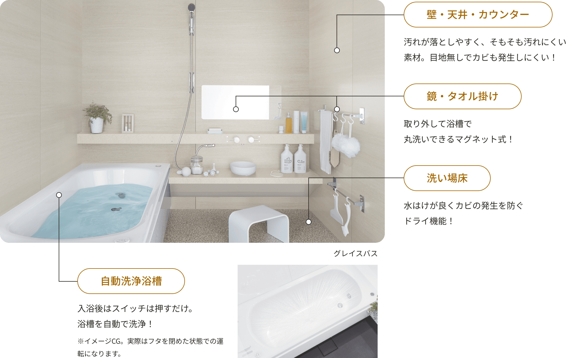 簡単にキレイにできる浴室。