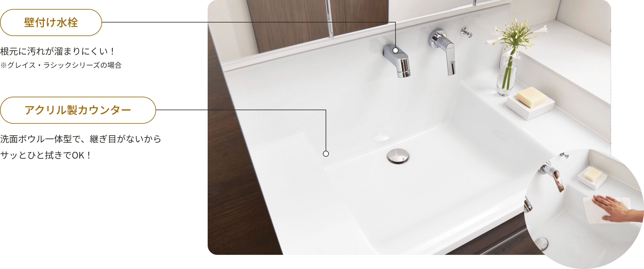 ※グレイス・ラシックシリーズの場合洗面ボウル一体型で、継ぎ目がないからサッとひと拭きでOK!