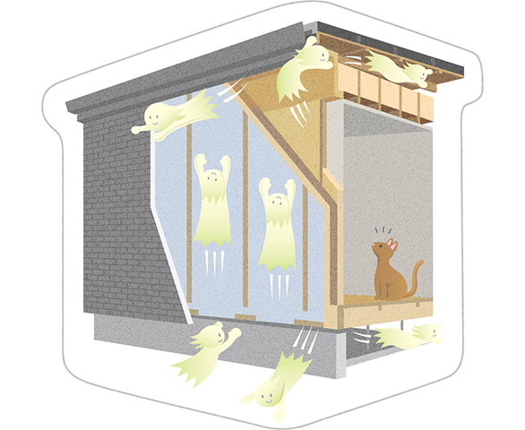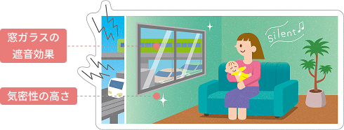 外からの音は、窓ガラスを通して入ってくることもありますが、実は、家中の見えないすき間からも入ってきます。一条は家全体の「気密性」と、窓ガラスの「遮音性」の両方が高く、騒音をシャットアウトできます。
