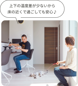 24時間つけっぱなしの全館床暖房なら、起床時も布団からスッと出られ、朝の身支度もスムーズにできます。廊下やトイレなど部屋間の温度差もないため、夜中の授乳やトイレも寒くありません。