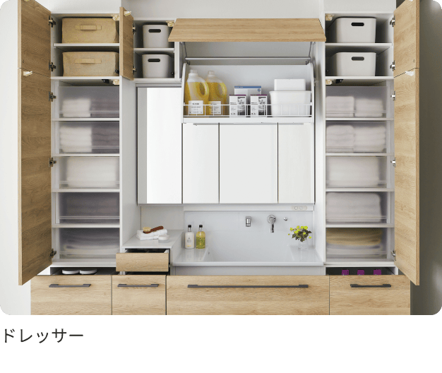 そのまま収納タオルも下着もパジャマもしまえる大容量の洗面台だから、収納もその場で完結できます。