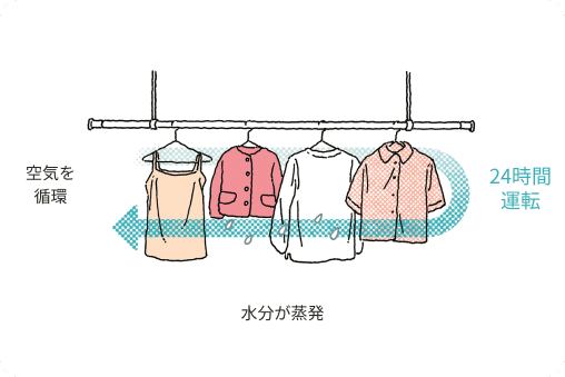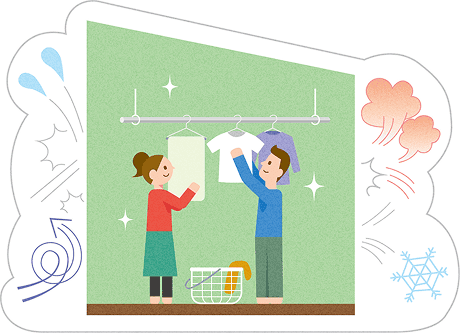 湿度交換も同時に行う換気システムが、外からムダな湿気が入るのを防ぎます。天気や気温、湿度に影響されにくいので、たとえ梅雨時期などのジメジメした日でも乾きやすい室内をキープ。だから季節を問わず部屋干しができます。