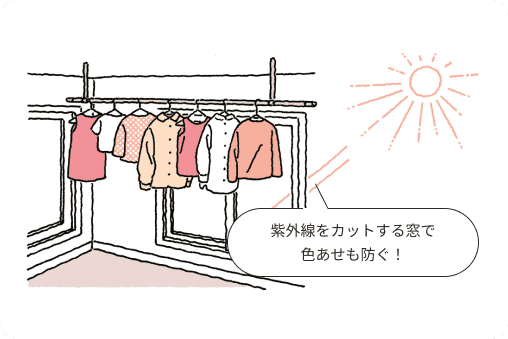 屋外に洗濯物を干すと、衣類に花粉や害虫が付着して取り込む際に部屋にも侵入してしまいます。花粉の侵入を防ぐ気密性の高い住まいで洗濯物を干せば、有害物質はもちろん、根本的な花粉対策にもなります。