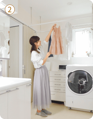 その場で干せる物干し金物を洗濯機のすぐ近くに設ければ、干す際の移動距離を短くできます。